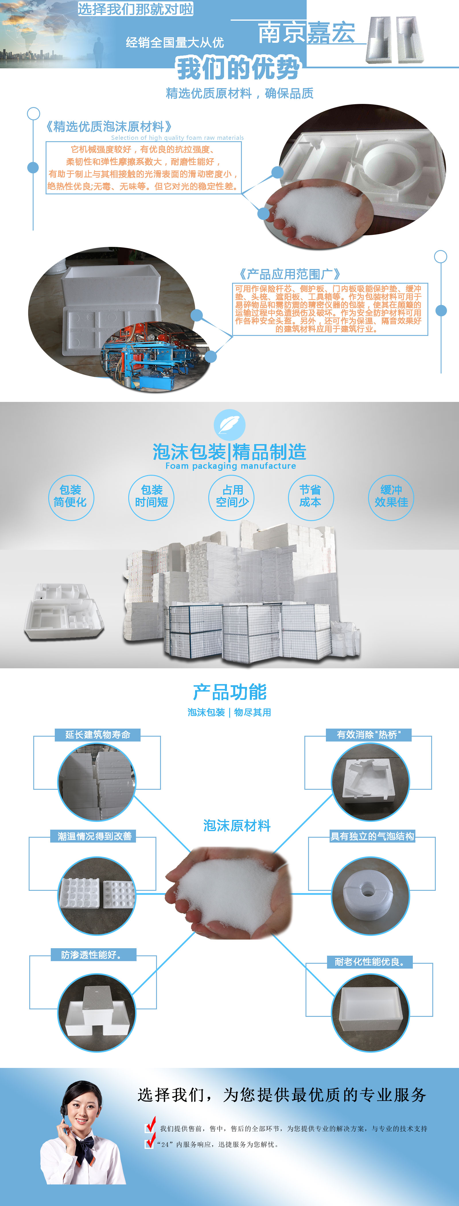 南京嘉宏包裝有限公司是泡沫箱、泡沫外墻保溫、珍珠棉、泡沫盒等產品生產加工的公司,擁有完整、科學的質量管理體系。我公司擁有好的技術和銷售團隊,員工數壯大,南京嘉宏包裝有限公司的誠信、實力和產品質量獲得業界的認可。公司一貫堅持“質優價美、用戶至上”的宗旨,竭誠希望與新老客戶合作與溝通.隨著市場需求量的不斷增加,我們將在提高質量、增加品種的前提下,進一步擴大生產和銷售規模.我們將以優良的產品,良好的信譽,合理的價格和完善的服務與各界朋友合作.真誠期待您的光臨,歡迎各界朋友蒞臨參觀、指導和業務洽談。